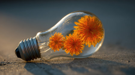 A unique light bulb filled with vibrant flowers and green leaves, symbolizing the harmony of nature and technology, showcasing beauty and sustainability in a serene setting.