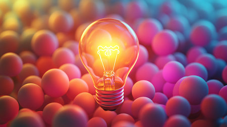 A glowing light bulb emits a warm yellow light, surrounded by vibrant pink, purple, and blue spherical objects in soft focus.