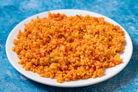 Bulgur pilaf on a blue background. Close-up of Turkish food Bulgur Pilav in a ceramic plate