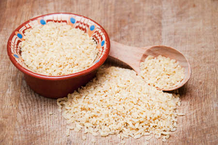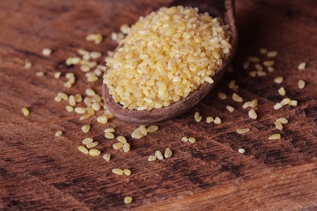 Uncooked bulgur in wooden spoon, rustic style. Bulgur wheat grains. healthy food