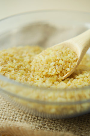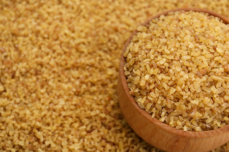 Uncooked bulgur close-up, healthy eating concept, food background.