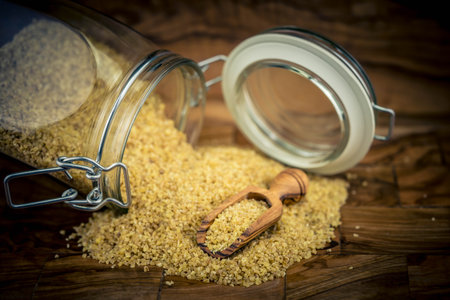 Dry bulgur wheat in wooden spoon on rustic background. Spilled bulgur