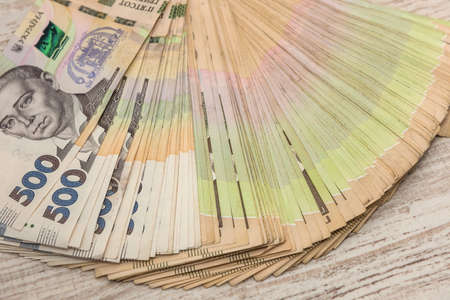 Cash concept. Pack of new Ukrainian paper money on wooden table.