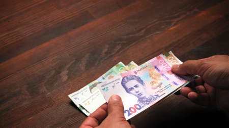 Male hands counts paper money holding pack of new Ukrainian banknotes, hryvnias on wooden table. Exchange, concept. Close up shot.