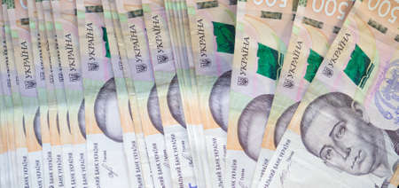Close up of a set of Ukrainian money with a face value of 500 hryvnia. Background of the five hundred hryvnia banknotes. Enterprise capital investment, finance, savings, corruption and bank concept