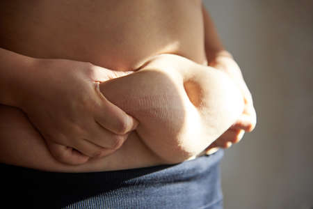 Close up of Man touching his fat belly, Men's hand holding excessive belly fat. Being overweight is one of the leading causes of major diseases such as heart disease, stroke, high blood pressure.