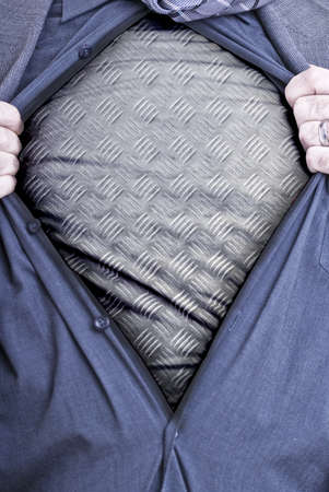 A businessman rips open his shirt and shows how tough he is by revealing a metal plate beneath printed on a t-shirt