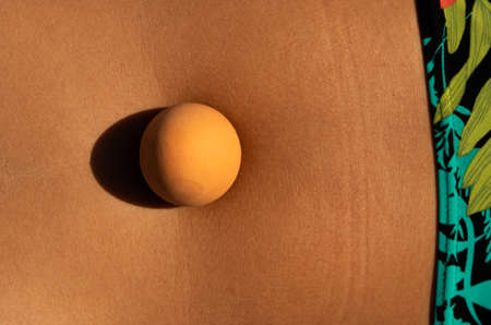 Egg on the body of a woman in a swimsuit. Abstract composition.