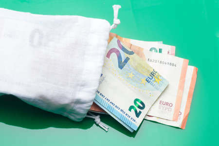 Bag full of money in Euro notes, Saving outside the traditional banking system. Euro banknotes inside a white bag. Money laundering.