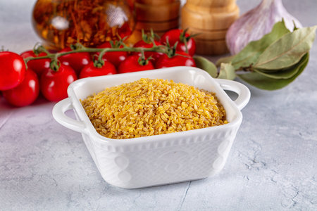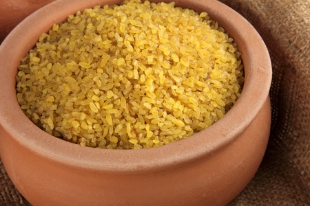 Organic bulgur raw wheat grain in ceramic bowl close up