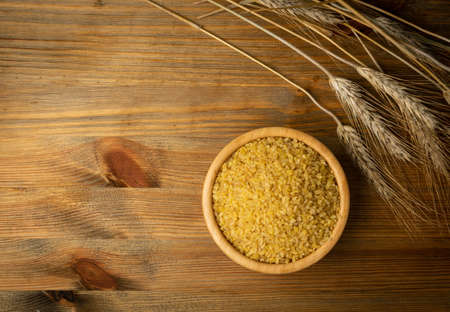 Bulgur heap in wooden bowl on wood background top view. Pile of raw bulghur, dry cracked parboiled wheat groats, cereal food closeup