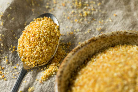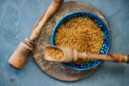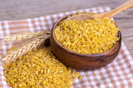 Uncooked bulgur in wooden spoon, rustic style. Bulgur wheat grains. healthy food