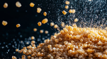 Bulgur grains are shown levitating underwater creating stunning visual effect. dark background enhances vibrancy grains highlighting their texture.