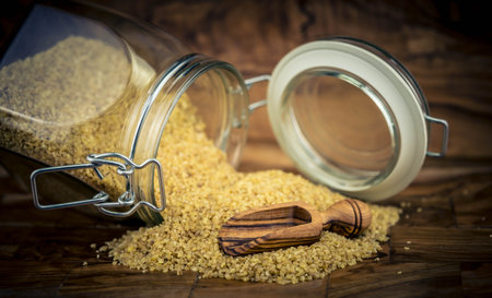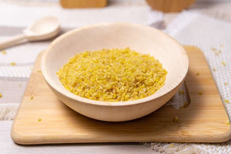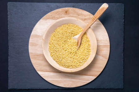 Wooden bowl full of fresh bulgur