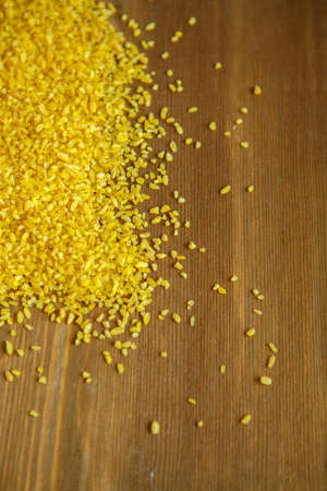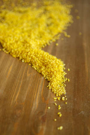 Croup of bulgur placer, pile on a wooden brown background. The product is rich in protein, healthy food, vegetarianism. Yellow and brown. View from above. Side view. Close up