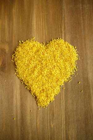 Croup of bulgur placer, a pile on a wooden brown background is lined in the form of a symbol of the heart, valentine. The product is rich in protein, healthy food, vegetarianism. View from above