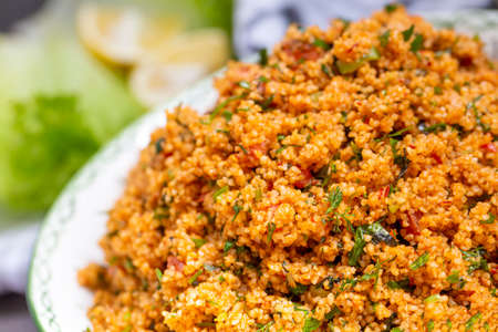 Raw bulgur wheat in traditional Turkish hand made ceramics ware.selective focus.
