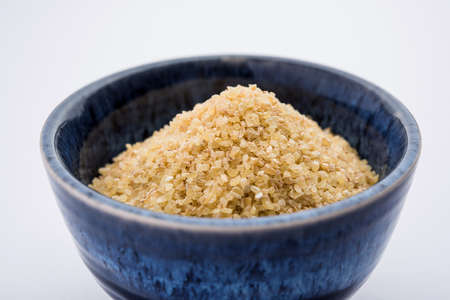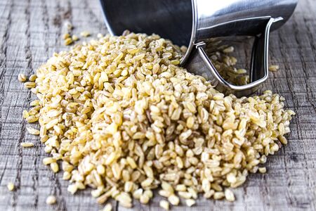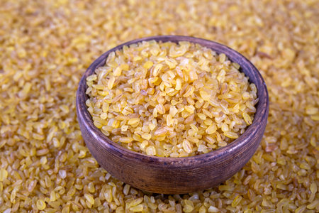 Uncooked bulgur close-up, healthy eating concept, food background.