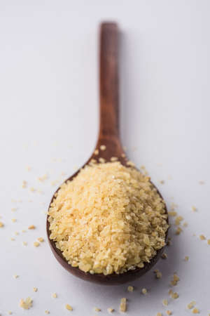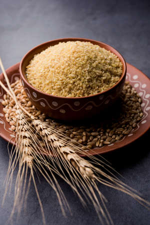 Gehu Dalia or Daliya also known as Cracked or Broken Wheat, served in a bowl or spoon, healthy Indian food