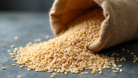 bulgur, cereal made from boiled, dried and crushed wheat. grains poured out of a bag on a dark background. upper view. side dish for meat dishes or a component of pilaf