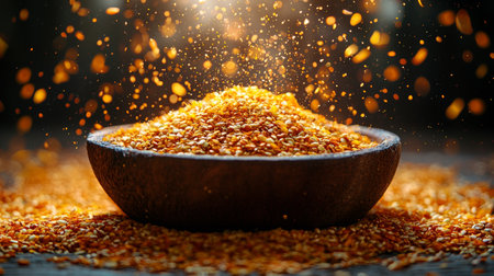 A mound of golden grains sits on a dark surface, illuminated by dramatic lighting that accentuates the texture and sparkle of each grain. The atmosphere is calm and serene.