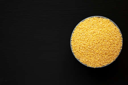 Bulgur lying in a heap on a dark background. Useful organic food for breakfast or diet. Plenty of room for text. Copy space.