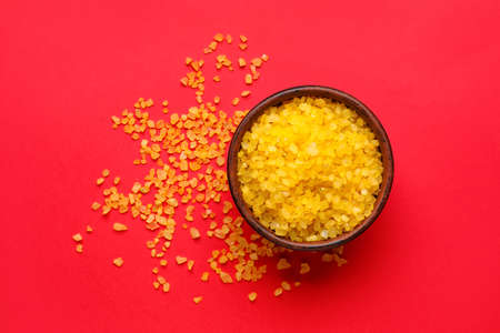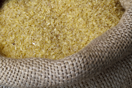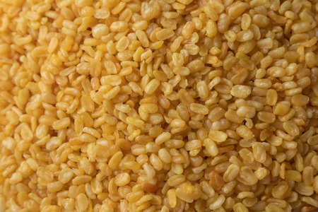 Bulgur grains texture background. Raw bulghur, dry cracked parboiled wheat groats, cereal food top view