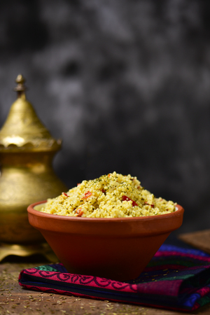 Bulgur on a dark background. Vegetarian Oriental food