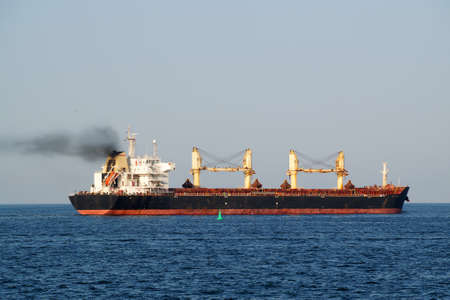 Cargo ship with black smoke from the chimney on the sea horizon.