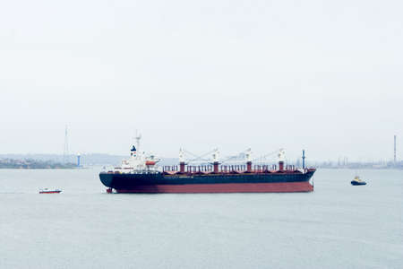 The dry cargo vessel enters the port with the help of tugs. Photo from a helicopter. Bird's-eye view