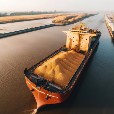 aerial view of a bustling seaport, where a massive cargo ship, a bulk carrier, is being loaded with wheat grains