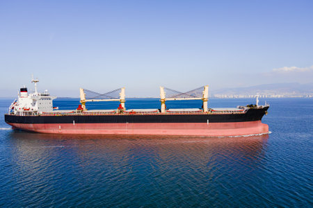 Large red bulk carrier (cargo ship) with a cranes sailing in an open sea from Europoort. Clear blue sky with cirrus clouds. Rotterdam, Netherlands. Global communications, logistics, industry theme