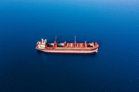 Bulk dry cargo carrier ship at anchorage preparing ship holds for new cargo freight. Aerial view