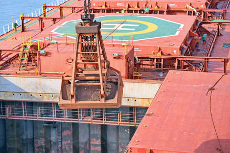 Loading bulk cargo of iron ore by ship cranes and grabs at the port. Seascape.