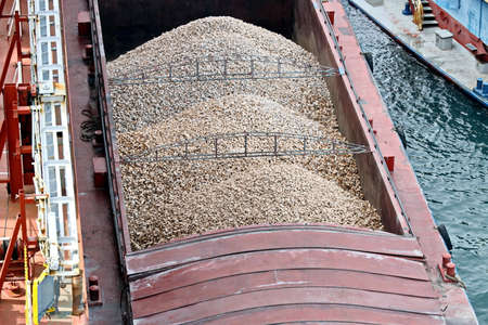 Loading bulk cargo of limestone from barges into a bulk carrier by using ship cranes and grabs at the port of Campha, Vietnam. October, 2020.