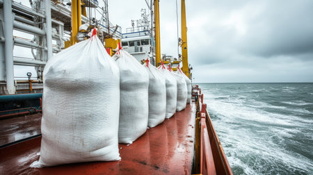 Bags of cargo sit on a ship deck, swaying gently in the stormy waves. The scene captures the essence of maritime transport and industrial shipping.