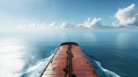 A cargo ship navigating through open seas, with a clear horizon and blue skies.
