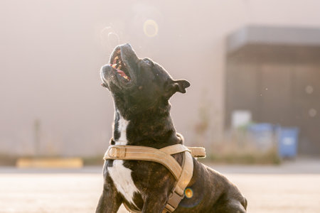 Dog running and playing in the park. Dog breed American Staffordshire Terrier walking in park.