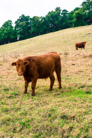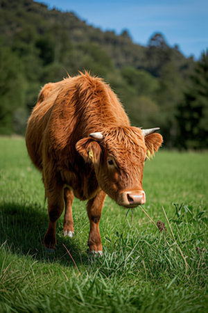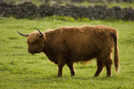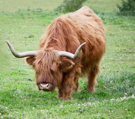 Highland Scottish hairy brown cow grazing on green grass pasturage.
