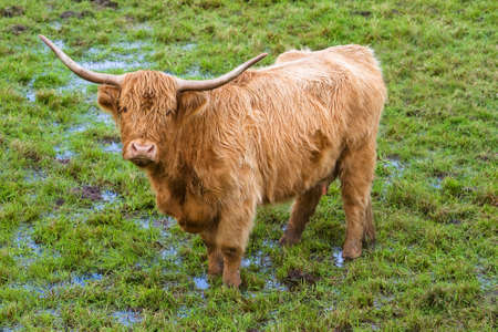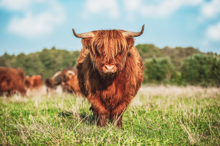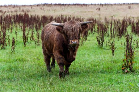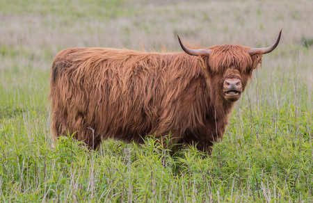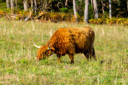 Beautiful Highland cattle Bull (Bos taurus taurus) grazing in field. Veluwe in the Netherlands. Scottish Highlanders in a natural landscape.
