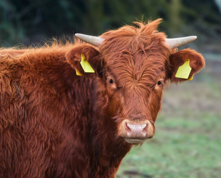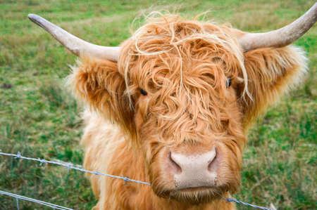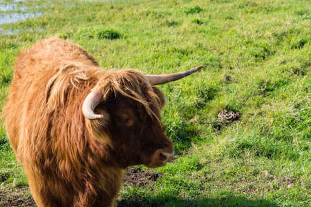 Highland cattle cow portrait on green grassland detail. Bos taurus. Face close-up of one domesticated livestock with horns and brown wavy woolly fur on a rural grazing. Eco pollution. Selective focus.