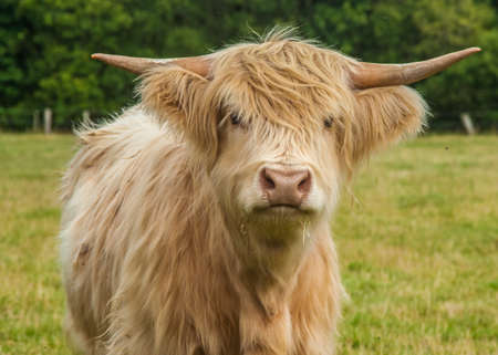 Close up of grass chewing highland cow on a green meadow which tries to look through its head of hair.