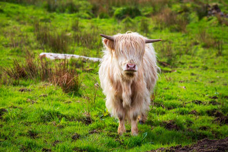 Close up of Highland Cattle, a Scottish cattle breed. Hairy cow with long horns and wavy coats. On the field in Isle of Skye, Scottish Highlands.