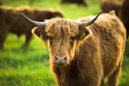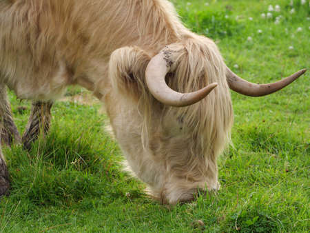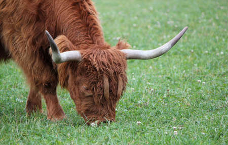 Portrait of a brown beautiful scottish cow with its two big horns eating the green grass