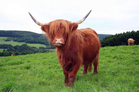 Highland Cow with red hair and horns standing in a field in Scotland with hills in the background.