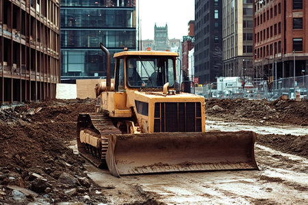 Powerful bulldozer moving ground on a muddy construction site, surrounded by modern buildings and urban development, showing the progress of city infrastructure