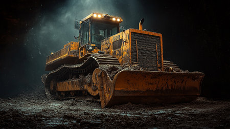 Heavy bulldozer working on a construction site at night. Heavy construction equipment.