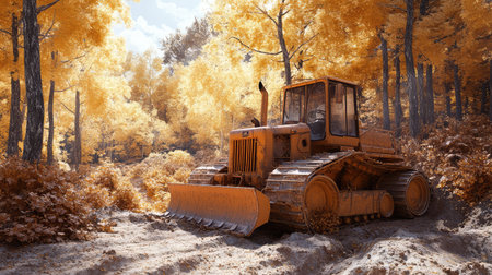 clearing bulldozer trees illustration path construction, development powerful, dense brush clearing bulldozer trees