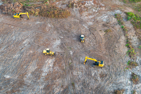 Aerial construction view of long arm excavator working on the field