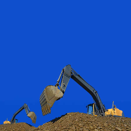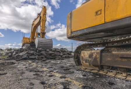 Photo of a yellow excavators digging the ground at a construction site. Constructional concept.